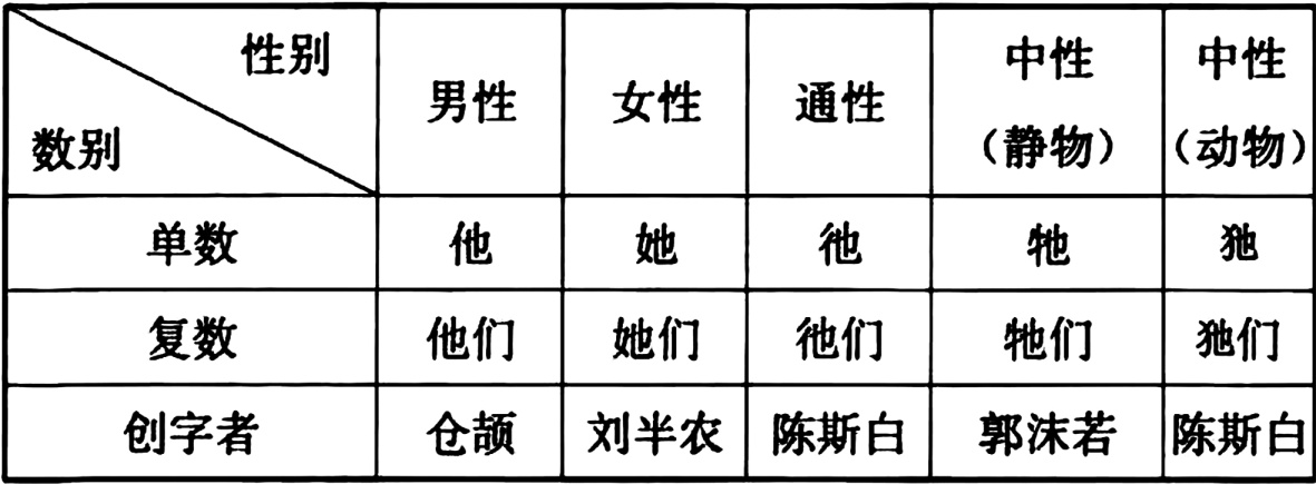 而陈望道也以图标系统阐述第三人称代词序列,主张单数分男性(他),女性(伊),中性(他),复数(他们) [14]。