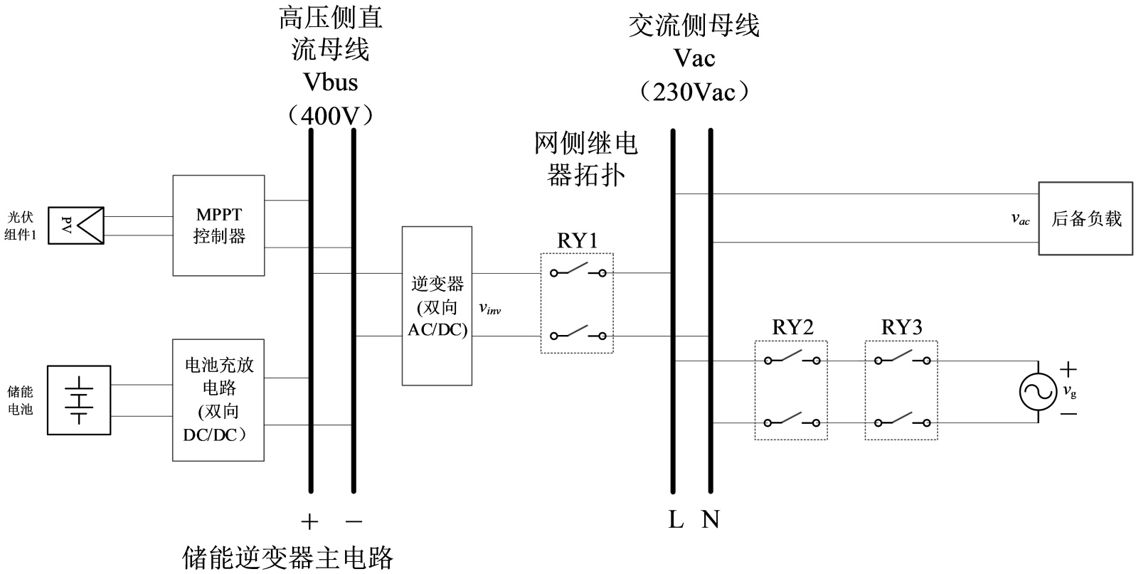 基于图1的网侧继电器拓扑构建储能逆变器的主电路架构如图2所示。由图2可见,所述第一桥臂中的两只继电器RY2和RY3经其常开触点串联后形成储能逆变器中交流侧母线与电网之间的电气通道;经第二桥臂中继电器RY1的常开触点形成储能逆变器中逆变器(双向AC/DC)的交流输出端与交流侧母线之间的电气通道。后备负载连接到交流侧母线,使得后备负载通过文中提出的网侧继电器拓扑,既可以由电网供电,也可以通过逆变器由光伏/电池的能量供电,即通过网侧继电器拓扑中第一桥臂从电网获得电能,或通过网侧继电器拓扑中第二桥臂从逆变器获得电能。在市电优先的模式下,当电网存在时由电网优先为后备负载供电,而当电网故障时可实现光伏/储能电池经储能逆变器为后备负载供电,从而实现后备负载的不间断供电[11]-[14]。