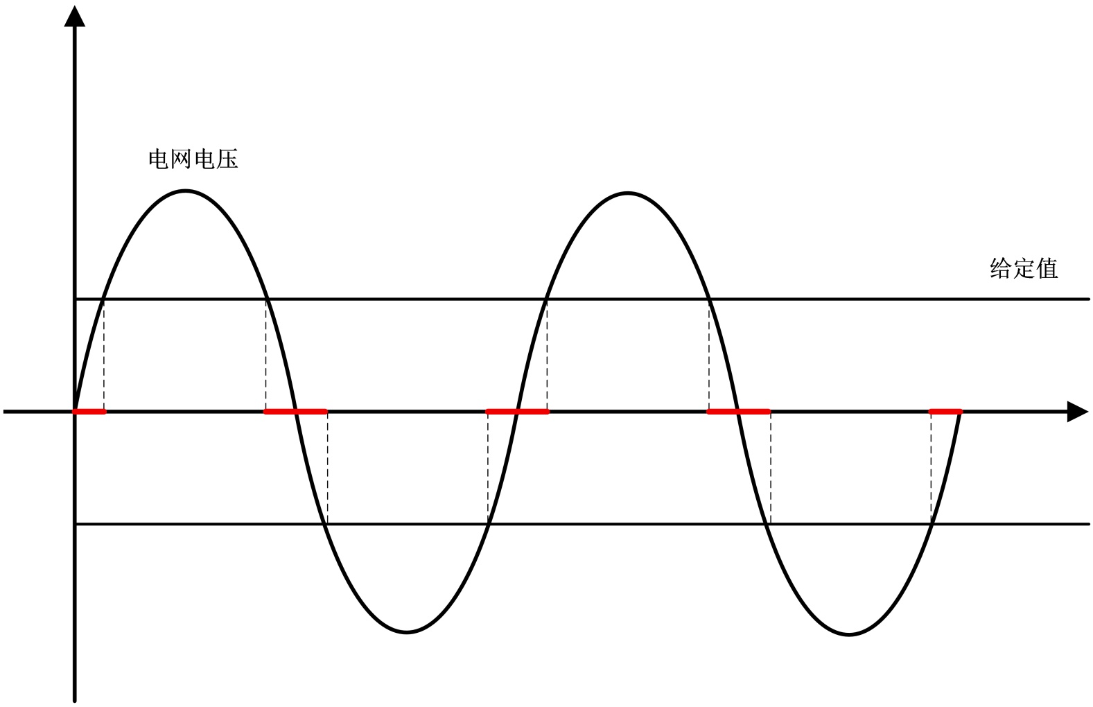 为了在电网发生故障时实现储能逆变器为后备负载的不间断供电,需要控制储能逆变器由并网运行模式快速切换到离网运行模式。本文给出了一种市电掉电快速检测方法,市电掉电快速检测原理如图3,电网电压为图中正弦曲线,电网掉电的电压设定值为图中的两条直线。通过与电网实际采样的瞬时值与电网掉电的电压设定值进行比较,红色区域是正常电网电压下限与低于电网掉电电压设定值所对应的固定低压计数区域。当电网掉电滤波窗口中统计的低于电网电压掉电设定值的低压计数点数大于这一固定的低压计数点数则判断为电网发生了掉电故障,若在电网掉电滤波窗口中统计的低于电网电压掉电设定值的低压计数点数小于固定的低压计数点数,则判断为此时的电网正常即未发生电网掉电故障。采用本文提出的电网掉电快速检测方法,当遭遇电网掉电时储能逆变器能迅速的判断出电网电压的掉电故障,并向网侧继电器拓扑的第二桥臂中继电器RY2和RY3发出让其线包失电的控制指令,同时让逆变器(双向AC/DC)由电流型控制方式切换成电压型控制方式,从而实现为后备负载提供不间断能量[7]。论文中的方法相较于现有方法只需要控制两个电网侧继电器就能实现流向负载能量切换,即基于提出的网侧继电器拓扑能实现能量的快速控制。