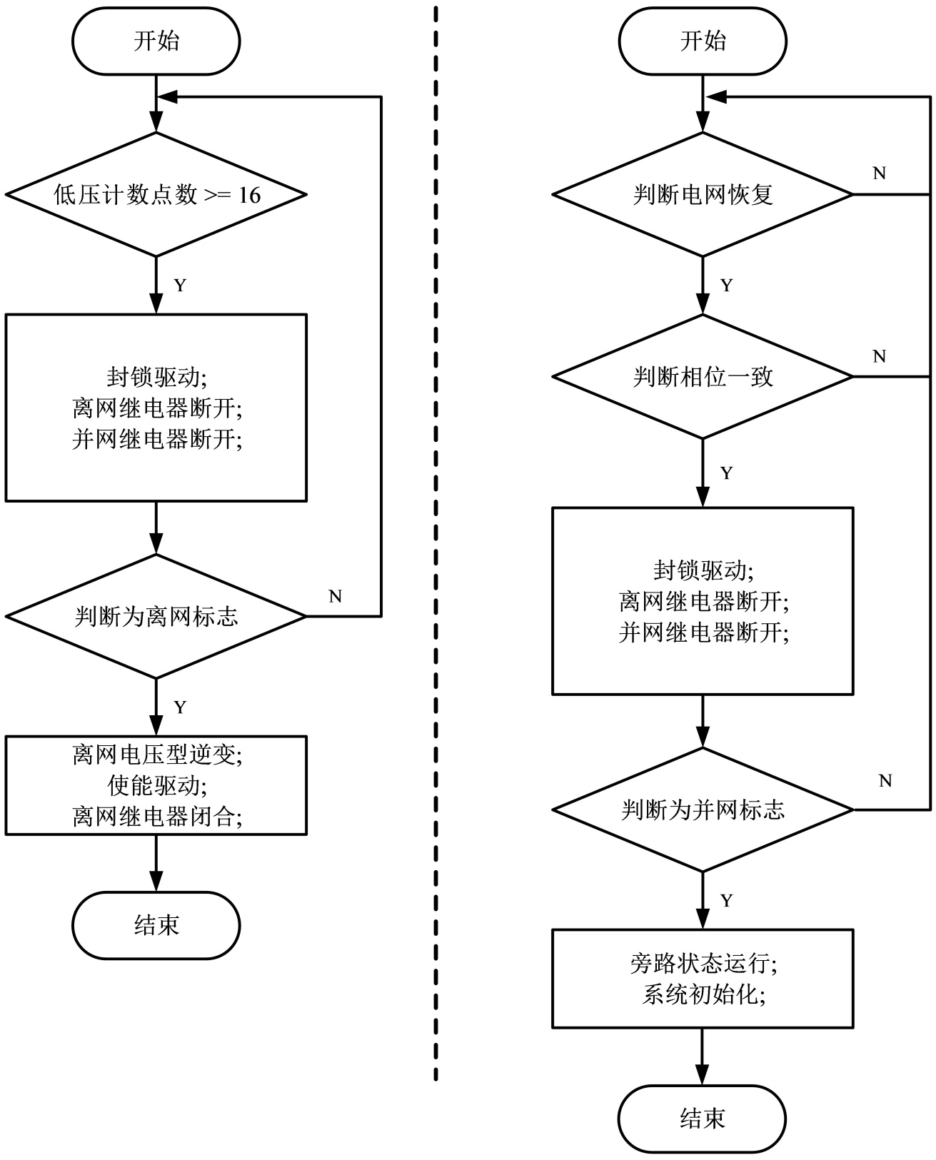 图5给出了并离网切换的程序流程图。左侧为并网切离网的程序流程图,右侧为离网切并网的程序流程图。