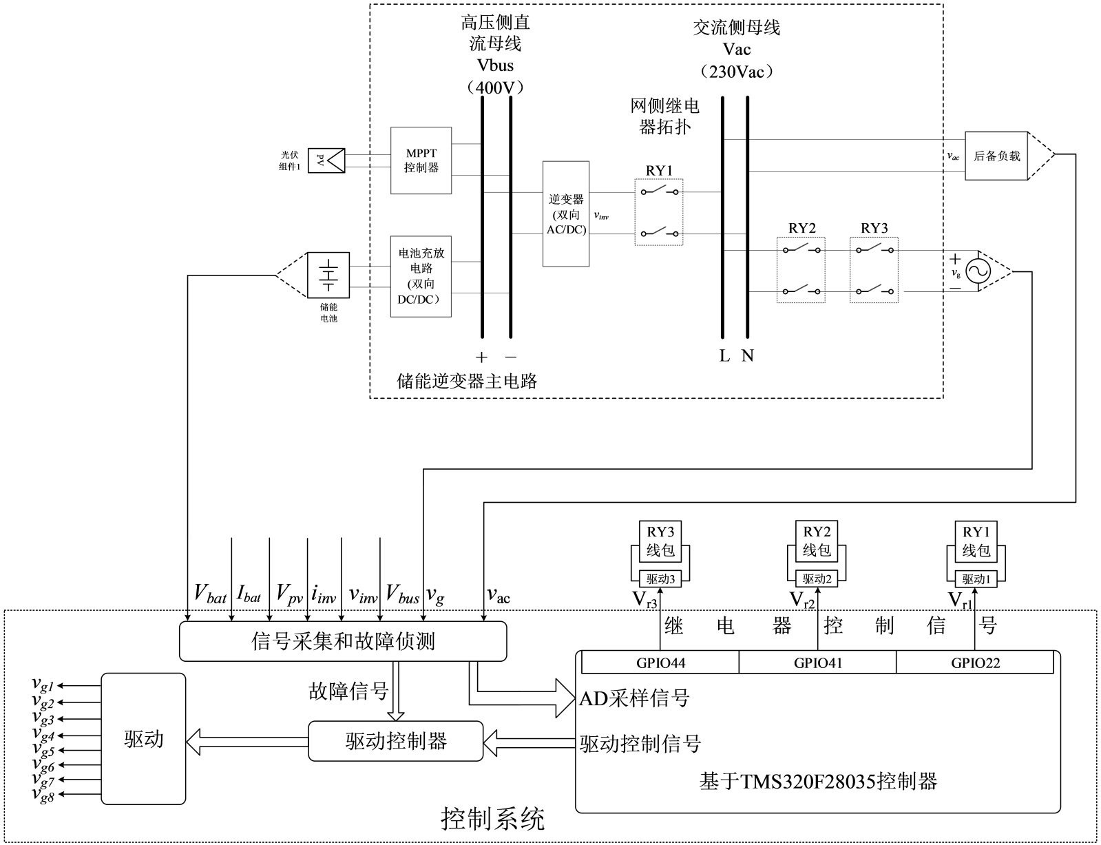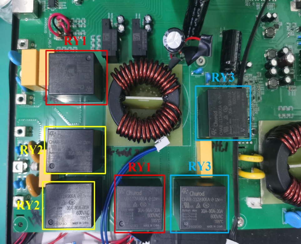 图7所示试验样机实物图,主要参数配置如下:图中6个继电器均选用Churod的继电器CHAR-112A90EA,其线包电压为12 V,只有一组常开触点,因此使用两个继电器组合的方式分别作为原理中的RY1,RY2,RY3。储能逆变器的最大功率5 KW,直流母线(高压直流侧)电压Vbus = 400 V,储能电池电压是48 V~63 V,PV组件的MPPT电压范围是200 V~440 V,交流侧输出交流电流23 A,电网额定电压230 V/50 Hz。由TI公司DSP型号为TMS320F28035的通用IO口GPIO22、GPIO41、GPIO44产生网侧继电器控制信号Vr1、Vr2、Vr3,再经相应的驱动1、驱动2、驱动3电路后为继电器组RY1、RY2、RY3的两个线包供电。