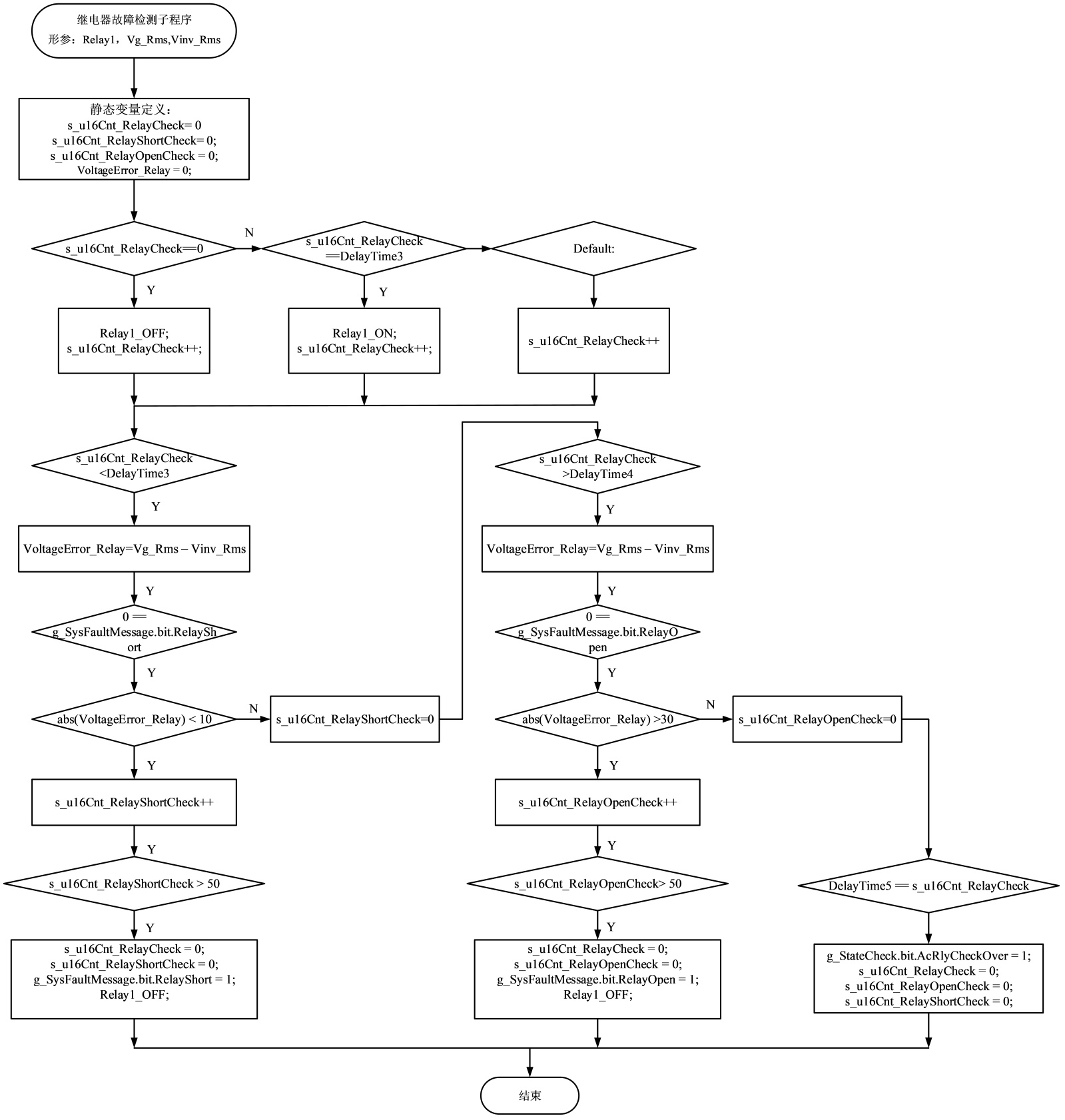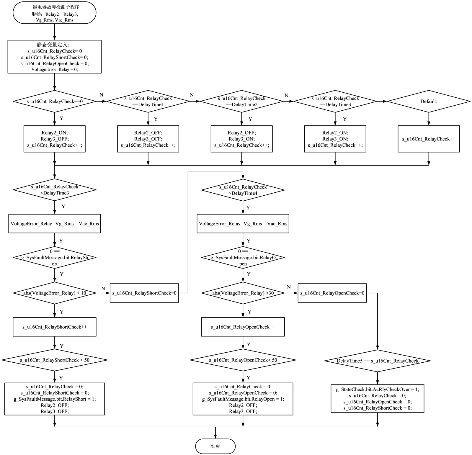 图8和图9给出了储能逆变器实例中调用子程序逻辑。定义了三个继电器形参(Relay1, Relay2, Relay3)以及三个电压有效值形参,分别为电网电压(Vg_Rms)、负载电压(Vac_Rms)与逆变器输出电压(Vinv_Rms)。此外,图中还声明了若干静态变量,包括继电器自检定时计数器(s_u16Cnt_RelayCheck)、继电器短路故障计数器(s_u16Cnt_RelayShortCheck)、继电器开路状态计数器(s_u16Cnt_RelayOpenCheck),以及继电器两端电压有效值误差(VoltageError_Relay)。这些变量共同用于实现继电器状态的检测与故障诊断逻辑。