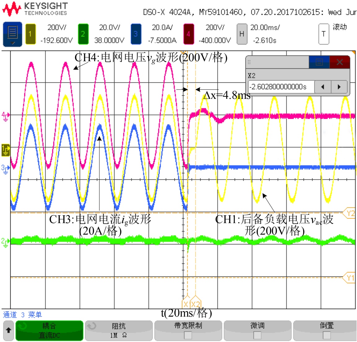 根据上面的分析可知当储能逆变器中网侧继电器拓扑的自检无故障后方可进入正常工作。图10给出了本文的应用实施例图6系统当检测到电网掉电故障,由并网向离网切换的实验波形,图10中的通道CH1是后备负载电压vac波形,通道CH3是电网电流ig波形,通道CH4是电网电压vg波形,实测切换时长Δx = 4.8 ms,远小于储能逆变器的相关标准所规定的小于20 ms指标要求,从而满足后备负载不间断供电的能量控制性能。
