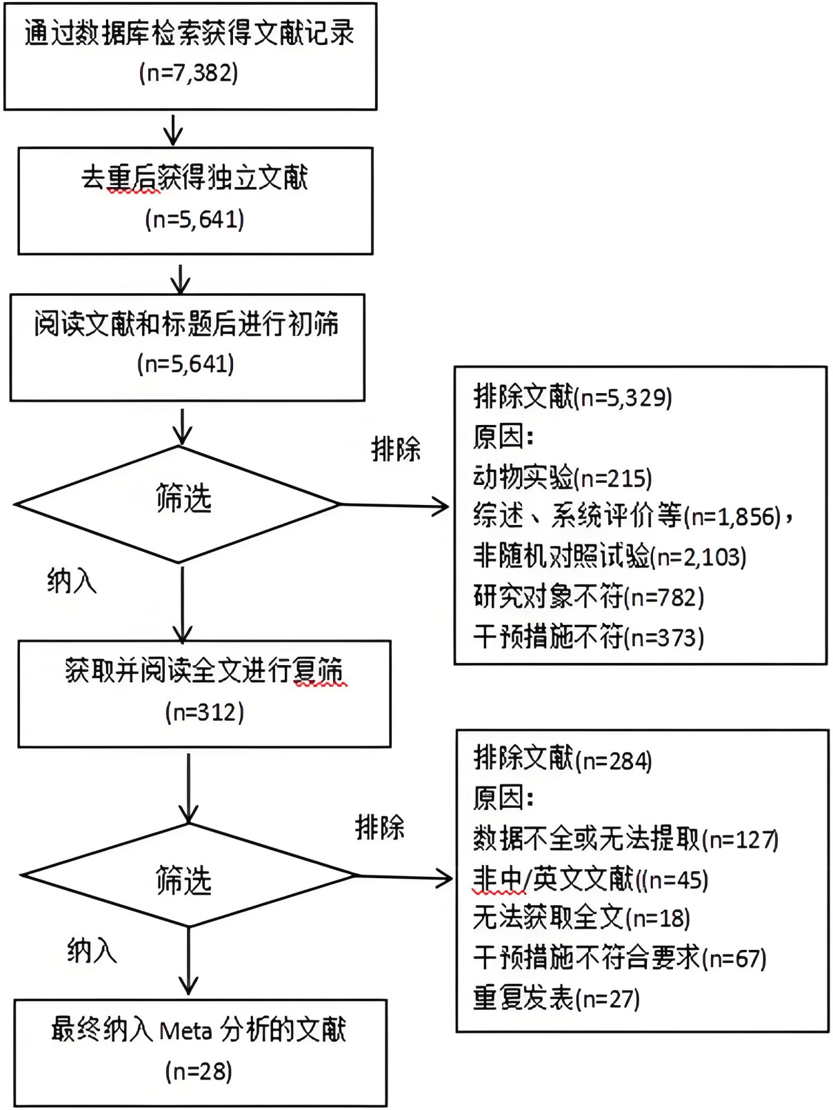 通过系统检索中英文数据库,初步获得相关文献记录共计7,382篇。利用文献管理软件NoteExpress去重后,获得5,641篇独立文献。通过阅读标题和摘要进行初筛,排除明显不符合纳入标准的文献,剩余312篇文献进入全文筛选阶段。最终有28篇RCT被纳入本项Meta分析。文献筛选流程图见图1。