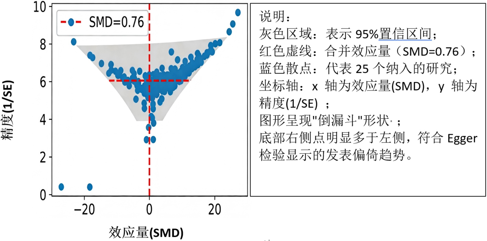 采用漏斗图结合Egger线性回归法,对纳入研究最多的结局指标“日常生活活动能力(MBI/BI)”进行发表偏倚评估。所绘制的漏斗图显示,代表各项研究的散点在图形上部分大致对称,但在底部左侧相对稀疏,右侧相对密集,呈现出一定的不对称性,提示可能存在发表偏倚,即阴性结果或结果不显著的小样本研究未能发表。发表偏倚漏斗图见图2。