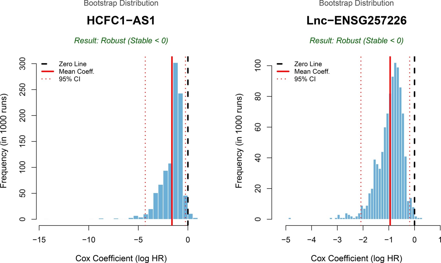 图2给出了最终多因素Cox模型的森林图及核心统计量。模型包含HCFC1-AS1与Lnc-ENSG257226两条lncRNA,其中HCFC1-AS1表现为显著保护因素(HR = 0.33, 95% CI 0.15~0.75, P = 0.008),提示其表达升高与死亡风险降低相关;Lnc-ENSG257226同样呈保护方向(HR = 0.47),但P值为0.055接近显著阈值且置信区间上界略超过1,提示该效应可能受样本量限制影响,需要更大样本进一步检验。图04同时报告模型C-index为0.84,表明在RT = Yes队列中模型具有较强的一致性与区分能力;AIC等指标亦提示模型复杂度较低且拟合合理。针对Lnc-ENSG257226在原始模型中P值(0.055)边缘显著的问题,为进一步验证其在小样本中的可靠性,本研究采用了Bootstrap方法进行1000次重抽样验证。图3显示,HCFC1-AS1与Lnc-ENSG257226的回归系数在重抽样分布中均呈现稳健的保护效应(Robust, Stable < 0),且其95%置信区间均未跨越0点。这表明尽管受样本量限制P值略高,但该lncRNA作为保护因素的稳定性良好,故保留在模型中。
