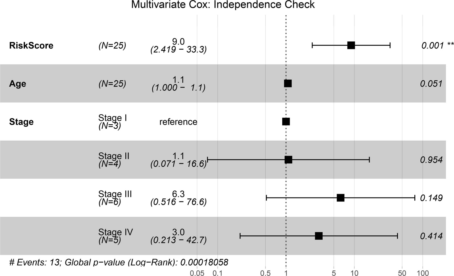 为评估RiskScore是否独立于临床特征预测患者预后,我们将RiskScore与患者年龄(Age)、肿瘤分期(Stage)一同纳入多因素Cox比例风险回归分析。如图5所示,在校正了年龄与分期后,RiskScore依然显示出极显著的预后关联(HR = 9.0, 95% CI 2.42~33.3, P = 0.001),证明其能够提供超越传统临床指标的额外预后信息。而年龄(P = 0.051)与分期在该小样本队列中未显示出独立统计学显著性。
