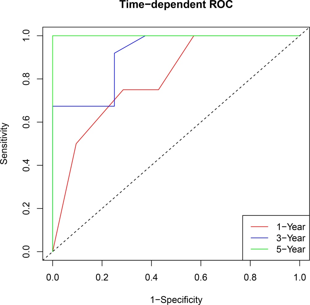 图6为timeROC曲线,分别评估RiskScore对1年、3年与5年结局的判别表现。图中不同时间点的ROC曲线整体显示出一定的区分能力,提示模型不仅可用于整体风险分层,也具有在特定时间窗口内预测生存结局的潜力[11]。