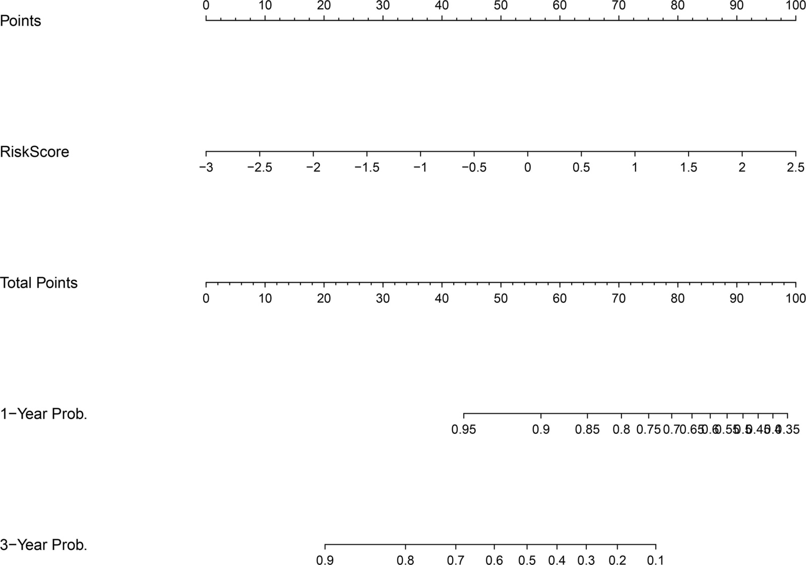 图8为基于Cox模型构建的列线图,将RiskScore映射为个体化的1年与3年生存概率预测。使用时可在RiskScore轴定位患者分值,投影至积分轴累积总分后读取对应时间点的生存概率,从而将模型从“统计意义”转化为“可操作的临床预测工具”[13]。