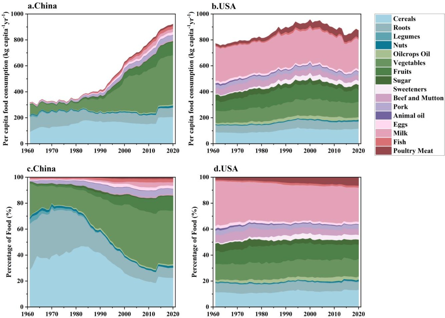 图1. 中美居民人均食物消费量及食物消费结构变化(a. b.分别为中国和美国人均食物消费量的变化趋势;c. d.分别为中国和美国食物消费结构所占比例的变化趋势。)