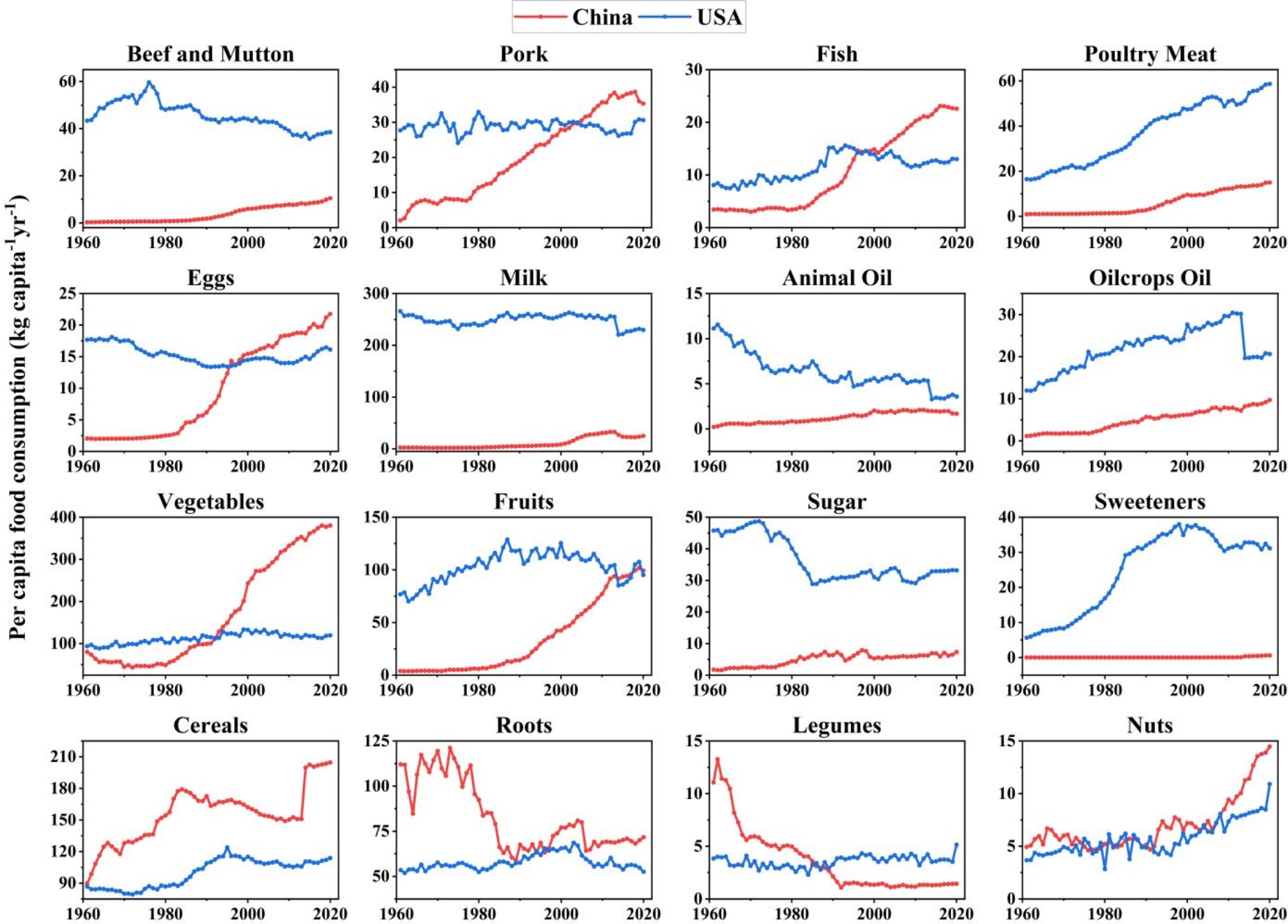Figure 2. Comparison of the consumption quantities of various foods by Chinese and American residents from 1961 to 2020