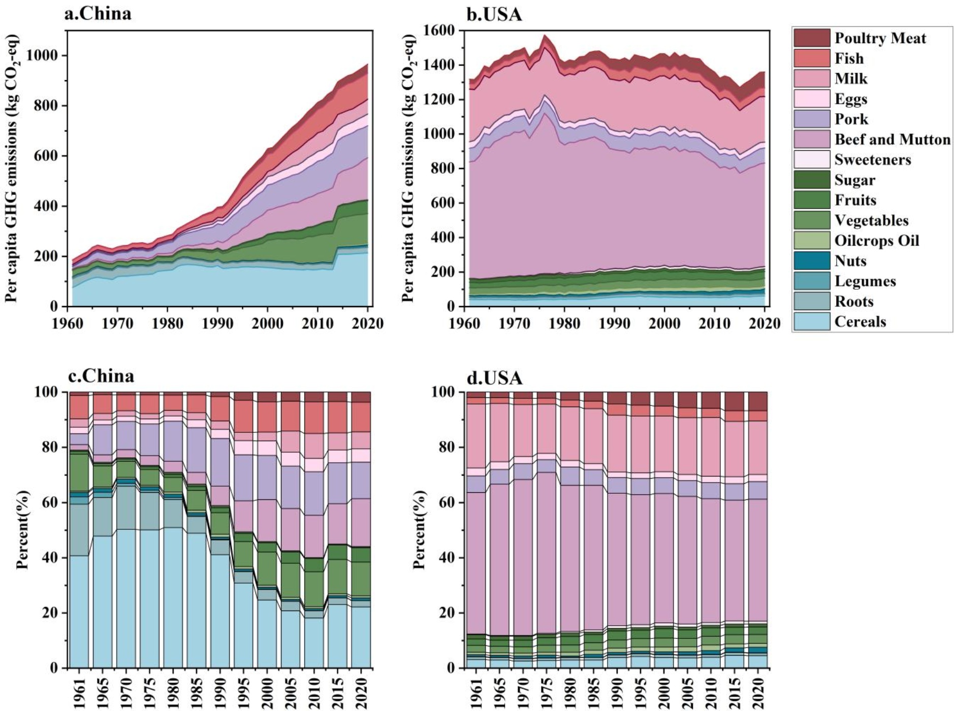 图4. 中美人均食物温室气体排放量及排放结构变化(a. b. 分别为中美两国人均食物温室气体排放量变化;c. d. 分别为中美两国温室气体排放结构变化)