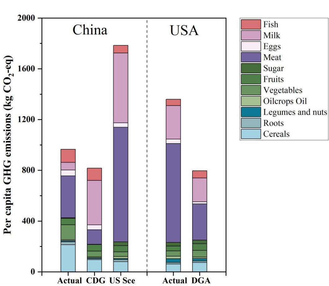 图6. 中美两国实际人均食物温室气体排放与膳食指南推荐值比较