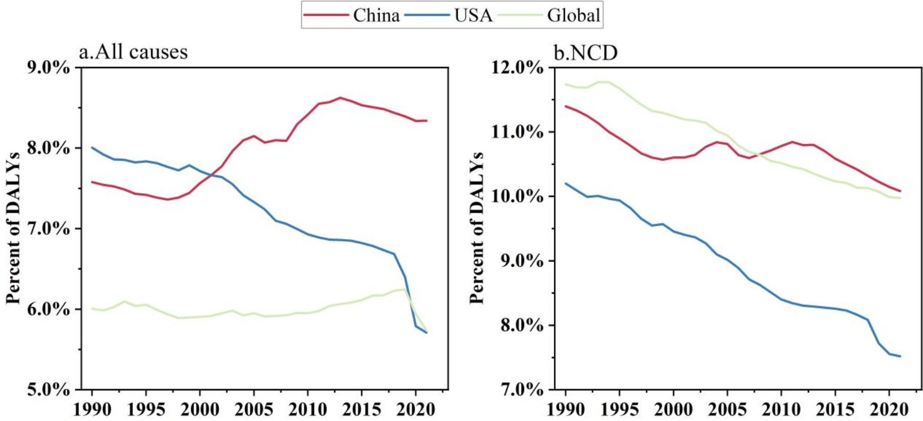 1990~2021年,由膳食风险引起的各种疾病的DALYs百分比在西方国家呈现下降趋势,而在中国则呈现上升趋势,且高于全球平均水平,并于2002年开始超过美国。而对于非传染疾病来说,从1990年开始,中国非传染性疾病可归因于膳食风险的DALYs百分比就高于美国,呈现下降–上升–下降的趋势,并于2008超过全球平均水平,美国则呈现下降趋势(图7)。