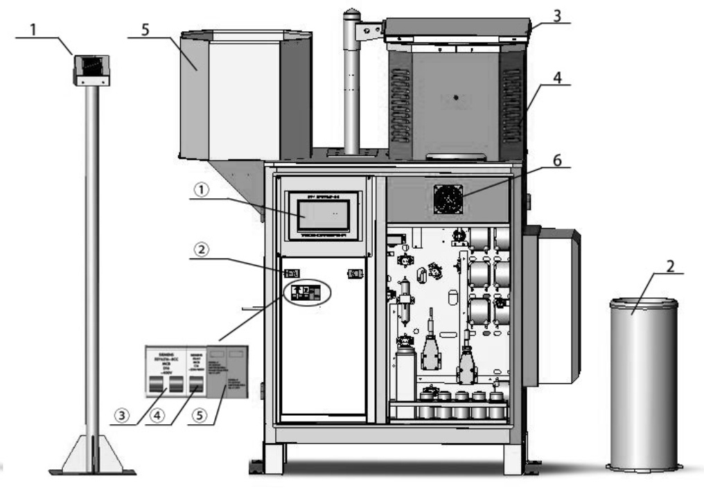 注:1:降雨感应器;2:雨量计;3:防尘盖;4:集雨桶;5:防尘盖托架;6:轴流风机;① 显示屏;② 箱门卡扣;③ 总电源开关;④ 避雷模块空开;⑤ 避雷模块。