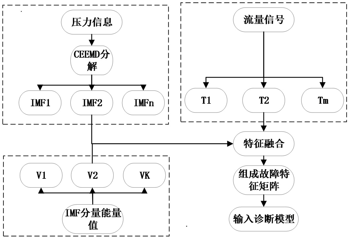 本文提出的多融合特征提取方法,利用CEEMD将压力信号进行分解得到IMF分量,结合各IMF分量下的能量值以及流量信号进行特征融合,如图3所示为切断阀多特征融合模型。其中,在对压力信号进行CEEMD分解时采用了定量分析,以分解得到的IMF分量与原始信号之间的相关系数作为评价指标,对IMF分量进行筛选。