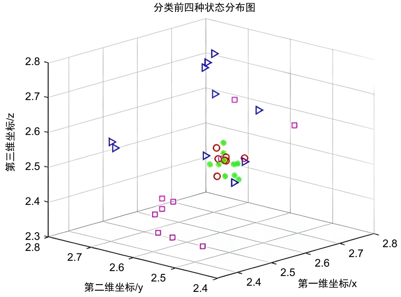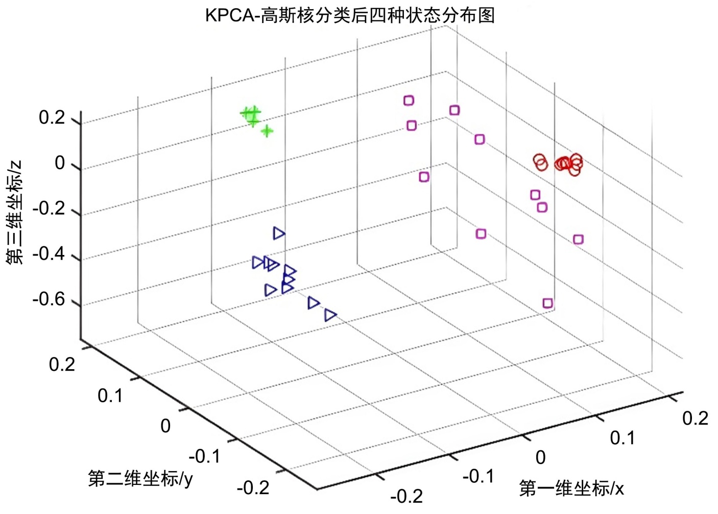 图8为特征降维前的数据分布图,图9为KPCA中利用高斯(RBF)径向基核函数分裂后四种状态的分布图。从图中可以看出,KPCA中的高斯核函数可以有效地将四种故障类型分离,使四种状态之间的距离比较合适,其每一种特征的聚拢度较好,因此本文选择高斯核函数作为后续工作的核函数,将特征降维后的最优特征集作为后续故障诊断的重要依据。