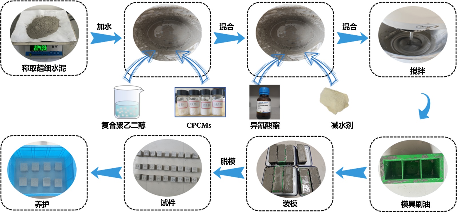 首先预试验以优化方案,在此基础上按配比称取聚氨酯、水泥和水,搅拌约5分钟至均匀,控制加水并持续搅拌不超过5分钟,模具涂润滑油后装料,振动密实,静置24小时脱模,最后在温度25℃、湿度98%条件下养护28天。实验流程步骤如下图1所示。