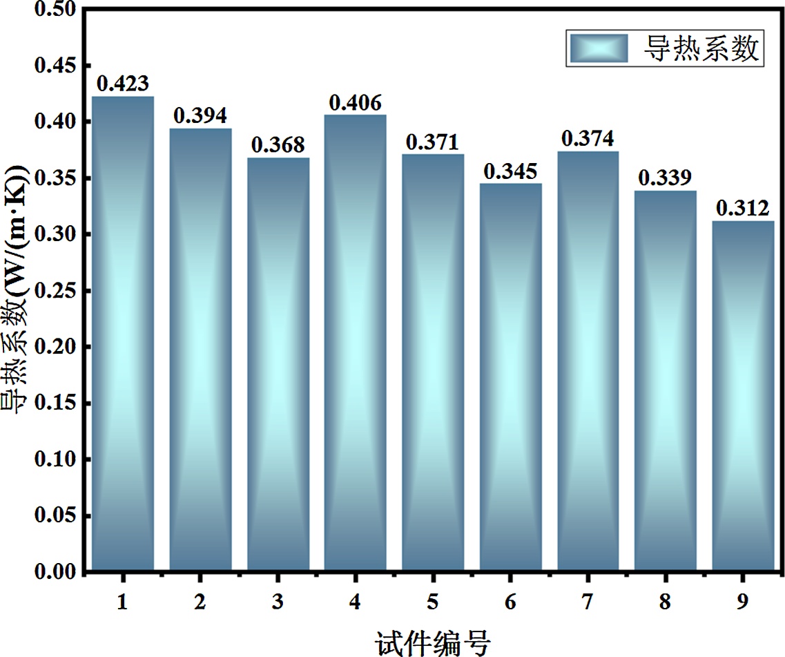 图3为28 d养护龄期的9组低蓄热聚氨酯–超细水泥试件导热系数数据直观图,其导热系数范围在0.312~0.413 W/(m∙K)。