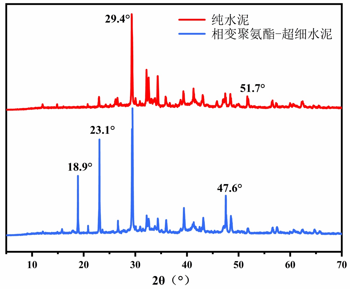 图4. 纯水泥和低蓄热聚氨酯–超细水泥的XRD图