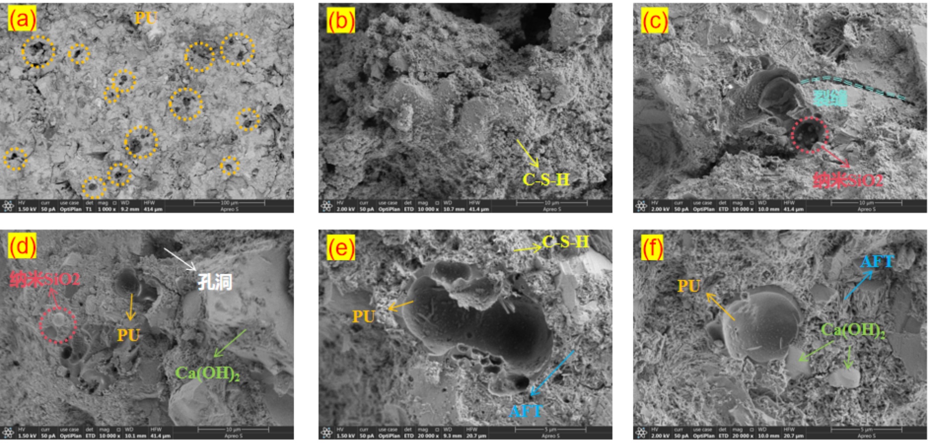 复合注浆材料的SEM图像如图5所示,材料中聚氨酯以薄膜状或颗粒形态填充于水泥基体孔隙中,与水泥基体结合良好,界面处无明显缝隙,无定形凝胶状C-S-H通常呈絮状或片层状,是水泥基体的主要强度来源。聚氨酯与C-S-H形成互穿网络结构,界面结合强度较高。图5(b)中可以看到呈不规则状的孔洞结构,这可能是由于水泥水化不完全导致的收缩孔隙,或者是聚氨酯发泡过程中引入的气体,在一定程度上会降低材料的抗压强度。图5(e)和图5(f)可以看到出现针状或棒状晶体的AFT,通常在水化早期形成,AFT的生成表明水泥中铝酸盐相(如C₃A)与硫酸盐发生了反应。