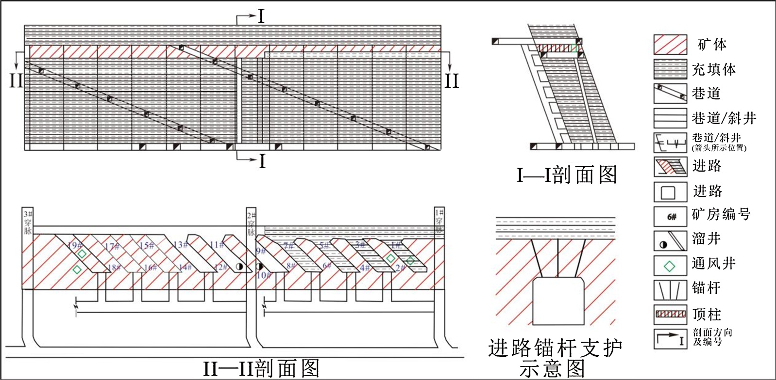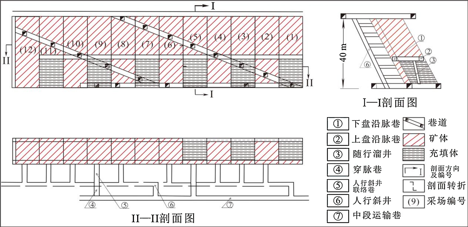 图2. 上向分层分支进路式胶结充填采矿法示意图