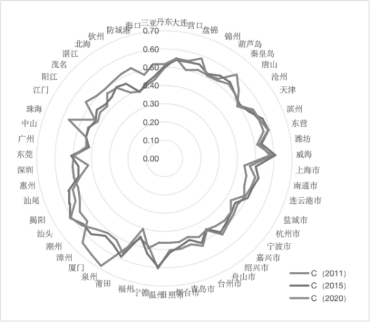从整体上来看,滨海城市的耦合度在2011至2020年间变化并不大在2011、2015、2020年的耦合度的平均值分别为0.50615、0.50778、0.50350,趋势为先上升后降低,主要的耦合度从拮抗阶段变成磨合阶段再变回拮抗阶段,其中,2011年至2015年的耦合度上升并不明显,而2015年至2020年的耦合度变化较大。