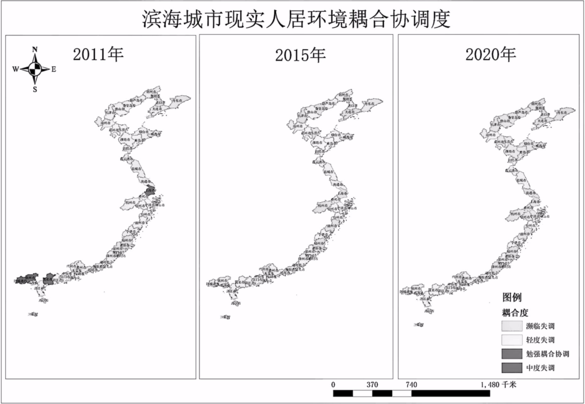图3. 2011年、2015年、2020年滨海城市耦合协调度