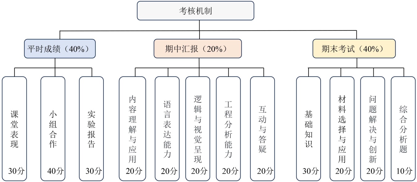 为适配“三维四阶”教学模式的能力导向目标,本阶段构建“过程–结果”双维度考核体系,突出“非标准化答案”评价导向。如图3所示,考核权重分配为:平时成绩40% (含课堂表现、小组协作质量、实验报告创新性)、期中汇报20% (采用PPT形式展示工程材料应用方案,重点考察逻辑推理与工程问题分析能力)、期末考试40% (闭卷形式侧重基础知识迁移能力,增设材料选用方案设计、工程问题解决方案等开放性题目)。通过多维度评价实现对“知识–能力–素质”三维目标的综合检验,避免传统考核中重记忆、轻应用的局限。