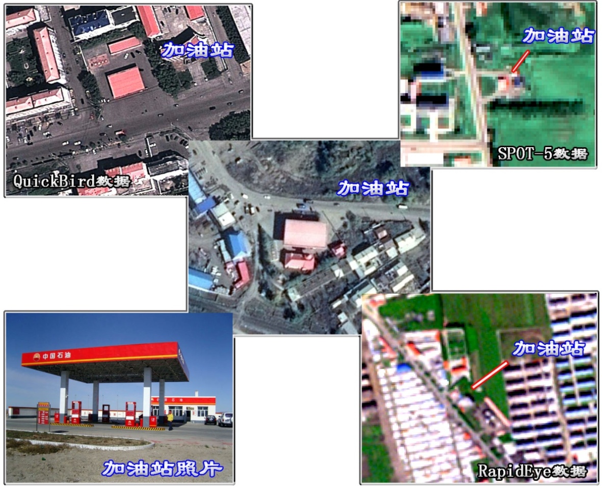 加油站多位于交通道路较为便利的地区,分别具有进出口。在QuickBird数据中可清晰的识别加油站的红色方形的顶棚,加油站的广场、等待加油的车辆及加油站。在SPOT-5数据中加油站面积较小,影像色调成亮白色,中间可见粉红色的方形顶棚和车辆进出口。加油站在RapidEye数据中特征不明显,需要结合实地验证情况进行补充(图2)。