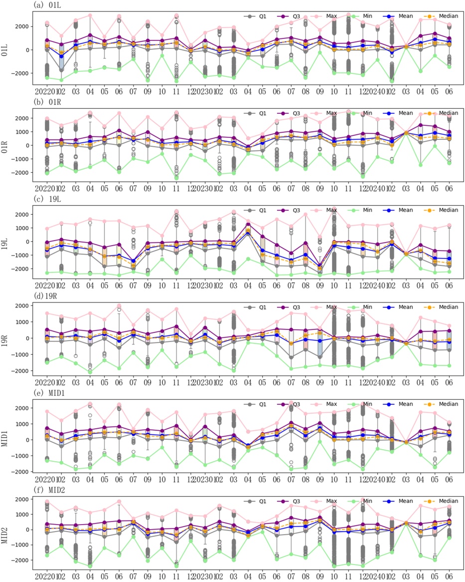 再从逐时尺度分析。从平均态来看,01 L和01 R的RVR距平在凌晨到上午(00~10时)均能维持在0线以上,数值相当稳定且波动很小,随时间变化趋势也基本一致。但自11时起二者出现明显差异,至17时01 L的RVR距平持续走低,而01 R的RVR则持续在0线之上波动。之后前者从18时起谷底反弹,后者则转为小幅度的负偏差。因此可以看出,01端在凌晨至早上RVR值较稳定且总处于高位。白天时段01 L更容易受天气影响,傍晚之后受影响程度降低,01 R则刚好相反。MID1和MID2的RVR距平的平均态差异性更明显,二者整体波动不大,但在整个夜间(18~08时) MID2均低于平均值,MID1则高于平均值。而白天则是MID2高于平均值,MID1明显降低。北头19 L继续表现出独一档的负偏差,几乎全天(除16、17时外)都低于0线且非常稳定,19 R则与MID1表现出较高的相似性。从极端值来看,6个测点均在夜间至早上出现较大的极值,在白天表现出一定的收束,但各自收束幅度并不相同——其中19 L的距平值十分稳定且在6个测点中最小值较低、最大值较小,19 R同时也表现出一定的相似性。MID1和MID2在白天的极值范围明显缩小,特别是MID2测点。01 L极值范围变化不甚明显,01 R与之类似,仅在11~14时段收束较明显,说明01端RVR全天受影响程度均不大。