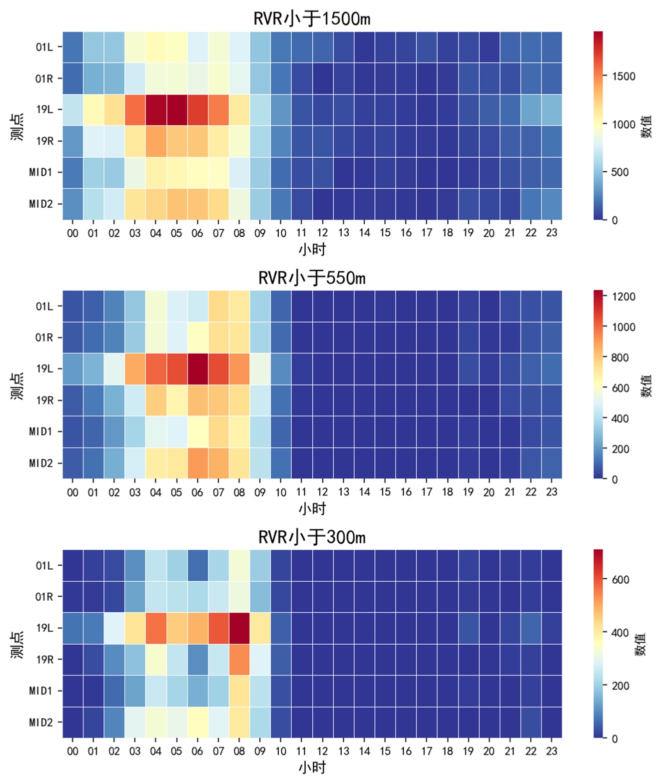 2) 各测点差异性上,19 L测点的RVR低值概率独立性极高,其余各测点与19 L相关性较高,同端测点之间的相关性仅在 < 550 m时相对更明显。此外MID1与19 R以及01 R与MID2的相关性也较高。结合距平的时间分布,无论是逐月还是逐时,19 L测点平均态都为稳定的负偏差,且极端值波动也较平缓,其余5个测点的平均态大致都在0线以上,偶有上下波动,但极端值跳跃幅度更明显,表明相较于19 L,其余测点RVR受影响程度偏小,受影响概率较为随机。