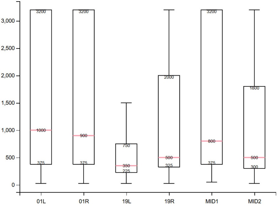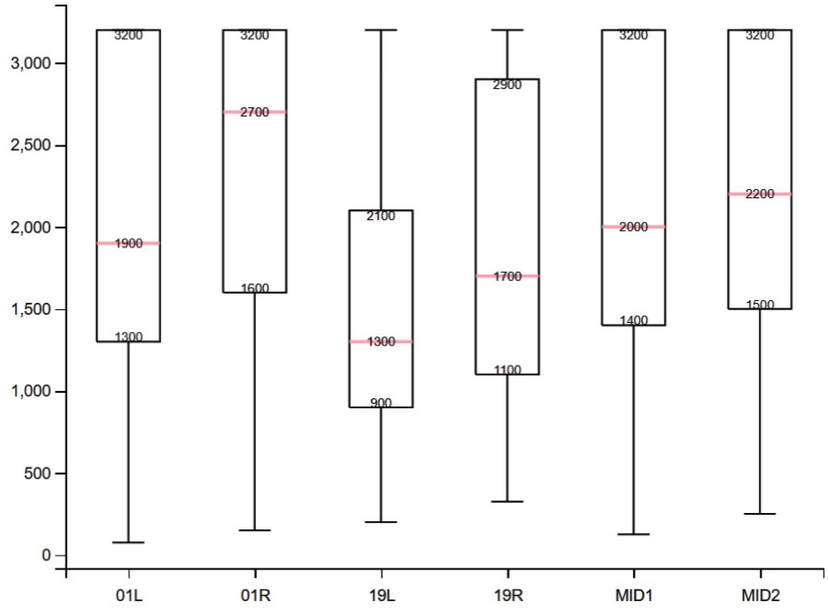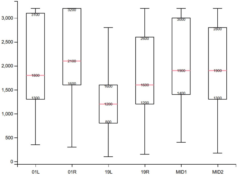 由图1可以发现,东、西跑道同一端RVR值存在明显差异,其中,差异最大的是19端,最小的是01端。除01端以外,西跑道各测点的RVR平均值高于对应的东跑道测点。此外,两条跑道19端、中间端、01端的RVR平均值自北向南依次增大,其中19 L测点的RVR平均值以突出的差距成为最低。对于标准差,各测点数据的标准差均较大,同端两个测点比较起来,中间端、01端RVR数据的离散程度都很接近,而19 L较19 R明显数据更为集中。