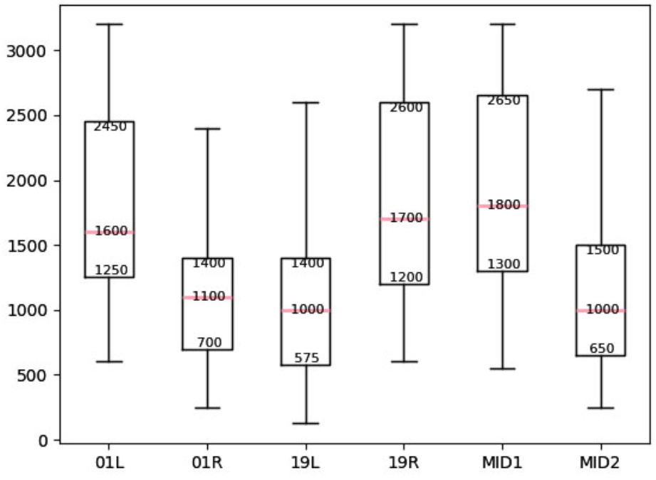 四种影响RVR值的天气现象中,降雪现象影响频率仅3%,为最小,但从影响程度来看,各测点的RVR中位数较静止锋天气和短时强降水要小,箱体区间也更为集中,仅次于雾现象。经查询历史资料,2022年1月至2024年6月贵阳机场共出现降雪天气13次,其中,造成任一测点RVR < 1500 m的有9次,影响最突出的为2022年1月30日至31日的中雪过程,持续221 min,RVR最低125 m。如图5(d),在降雪天气下,RVR受影响最大的测点为19 L和MID2,中位数1000 m;影响最小的测点为MID1,中位数为1800 m。01 R测点上下四分位数区间最小,为700~1400 m;MID1测点最大,为1300~2650 m。说明01 R的RVR值更集中,MID2的值最分散。因降雪现象造成的RVR最低值出现在19 L测点,为125 m。此外,在降雪天气下,东跑道各测点(01 R, 19 L, MID2) RVR值中位数比西跑道各测点(01 L, 19 R, MID1)显著偏低,箱体区间也明显更小,说明贵阳机场降雪现象对东跑道RVR值影响更大。