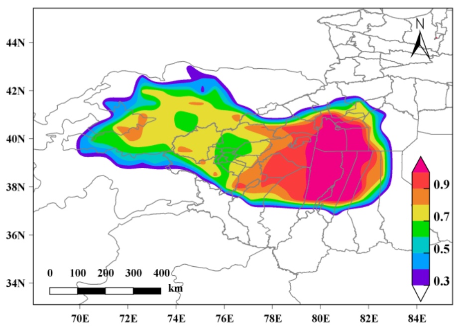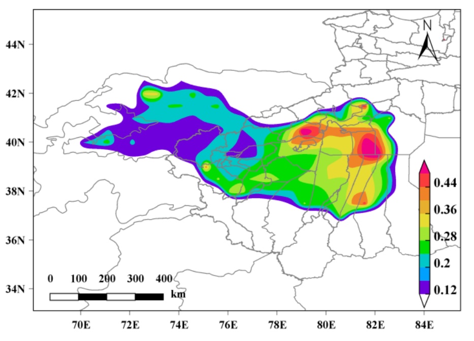 摘要: 基于全球同化系统(GDAS)数据及2018~2024年麦盖提县环境监测站逐小时颗粒物浓度数据等多源资料,运用大气团后轨迹聚类分析、潜在源贡献因子法(PSFC)和浓度权重轨迹法(CWT)等方法,分析麦盖提县颗粒物浓度的时空变化特征及不同季节外源污染物传输的路径及潜在源区。结果表明:(1) 麦盖提县PM