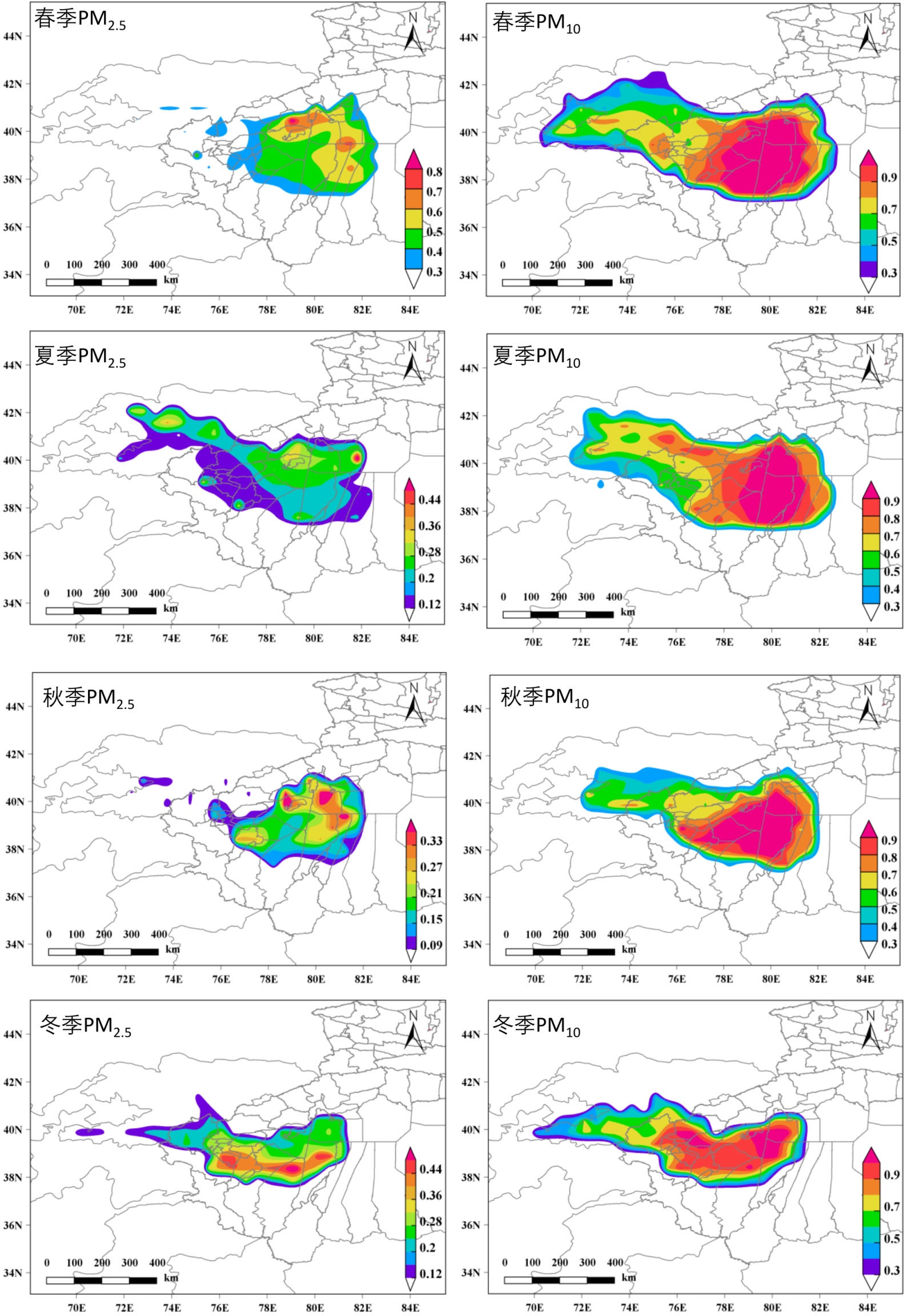 图4. 2018~2024年麦盖提县春、夏、秋、冬季节PM2.5和PM10潜在源区(PSCF)分布