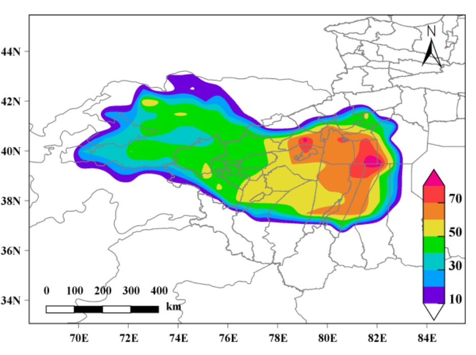 以麦盖提县环境监测(38˚53'47"N,77˚36'55"E,海拔高度1178 m)为中心,基于2018~2024年大气团后向轨迹数据(采用HYSPLIT模型,轨迹时长72 h,起始高度500 m),运用聚类分析方法划分气流路径(图2),麦盖提县大气团轨迹可分为3类,东南方向轨迹(蓝色,占比59.4%) PM2.5浓度为78 μg·m−3 (低于GB 3095~2012二级标准限值75 μg·m−3,超标率1.3%),PM10为286 μg·m−3 (超二级标准限值150 μg·m−3,超标率90.7%),移动速度缓慢,路径主要环绕麦盖提县,途经区域以农田、荒漠交错带为主,本地扬尘(农业耕作、地表裸露)是PM10的主要贡献源。东北方向气流(红色,占比25.7%) PM2.5和PM10浓度最大,分别为138 μg·m−3、480 μg·m−3,均超过国家二级标准,移动速度缓慢,轨迹途径区域分别为阿克苏地区、墨玉、巴楚和麦盖提县,形成PM2.5和PM10的复合污染;西北方向(绿色,占比11.8%)气流对应的PM2.5和PM10浓度相对较低,分别为60 μg·m−3、184 μg·m−3,PM10超过国家二级标准,PM2.5浓度低于国家二级标准,气流移动速度较快,途径区域阿图什、伽师、岳普湖和麦盖提县。揭示了干旱区绿洲城市“本地扬尘 + 跨区域源输送”的污染模式,建议针对东北向路径途经的工业–农业–沙尘过渡带加强扬尘管控与产业布局优化,同时强化本地农田地表覆盖措施以降低PM10污染。