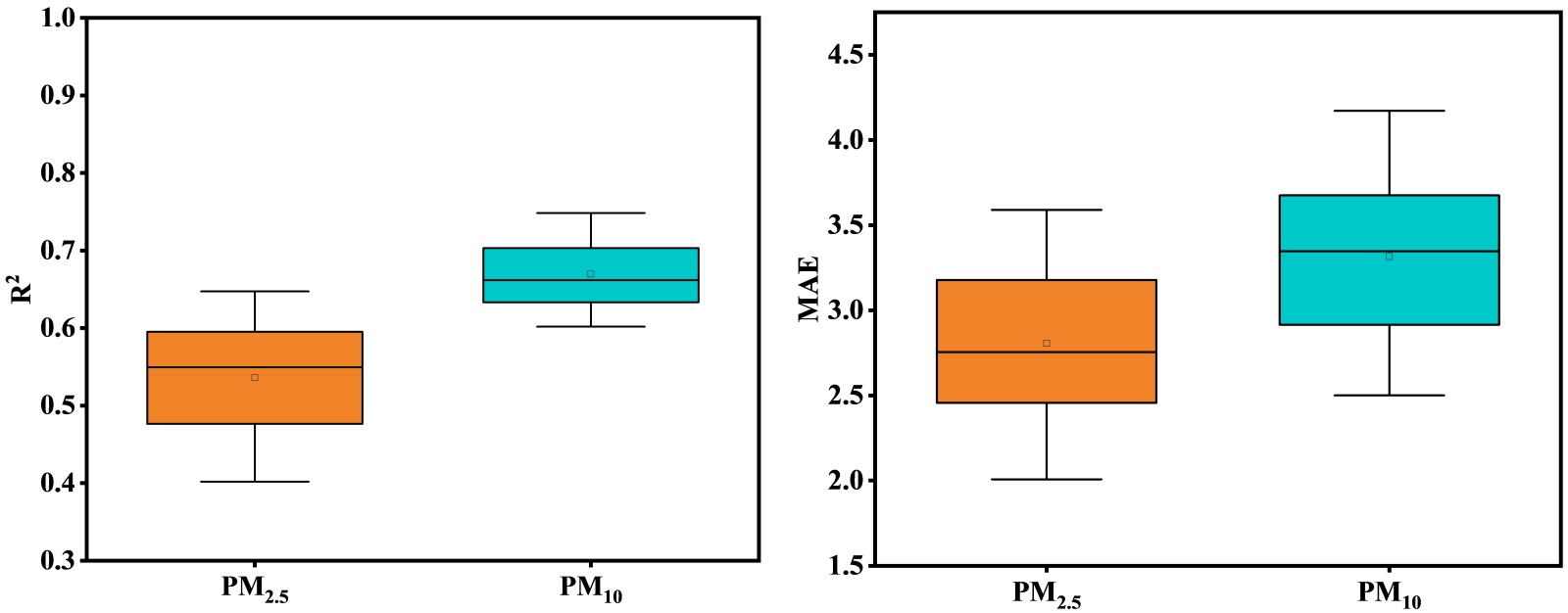 利用随机森林机器学习算法,针对麦盖提县PM2.5、PM10浓度数据及气象因子开展建模分析,通过构建决策树并进行500次迭代训练,量化评估评估气温、湿度、风速等气象因子对PM2.5、PM10浓度的非线性影响机制。计算模型的精度和效率,如图6所示,PM2.5和PM10随机森林模型的确定系数R2分别是0.53和0.70,表明模型对观测数据的解释力较强,具备可靠的学习能力与泛化潜力;PM2.5平均绝对误差MAE为2.8 μg·m−3,PM10模型MAE为3.3 μg·m−3,均低于同类研究中环境浓度预测的行业可接受误差阈值(±10%),验证了模型预测结果的稳定性与有效性。基于随机森林模型的变量重要性得分,PM2.5浓度受气温和相对湿度的驱动作用显著,反映出热力条件与吸湿增长过程的关键影响;PM10浓度则主要受制于风速和温度,体现了动力传输与扬尘释放过程的主导机制。