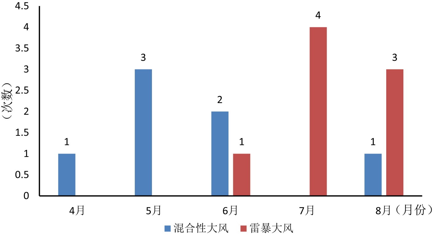 (1) 自贡市9级以上极端对流性大风主要分为混合性大风和雷暴大风两类,混合性大风高发于春季,雷暴大风高发于夏季,均以16时和21时为峰值时段。