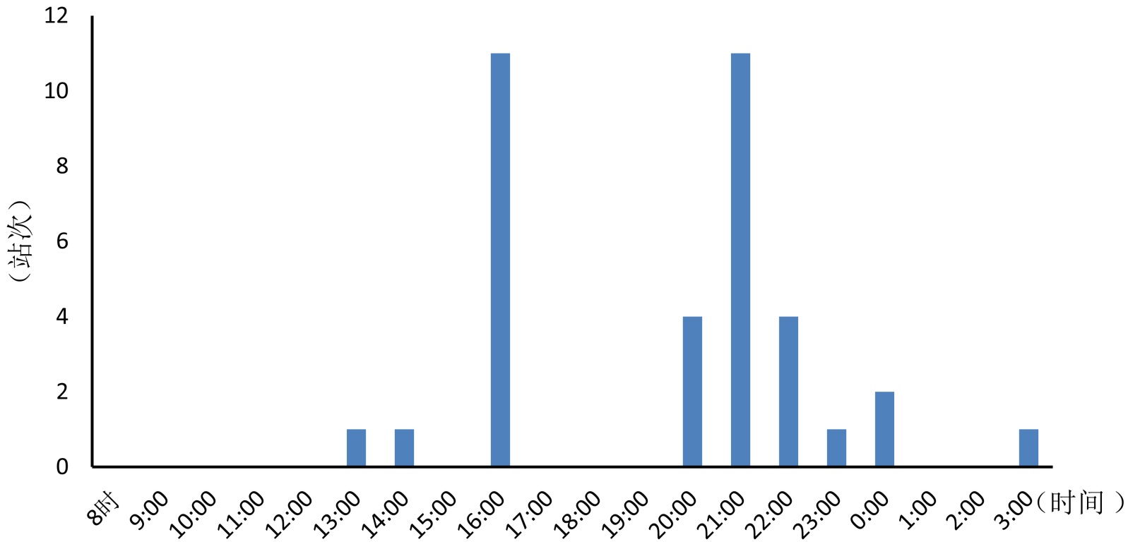 从大风发生的时间来看,9级以上混合性大风70%集中在春末夏初(4~6月),雷暴大风则主要发生在夏季(6~8月),其中7月发生频率最高(图1(a))。从小时分布特征来看(图1(b)),自贡的对流性大风主要发生在午后13~16时和夜间20~00时,又以傍晚16时和晚上21时频率最高。这主要是春季太阳辐射开始增强,下垫面增温快,大气层结开始变得不稳定,能量累积在午后到傍晚达到顶峰,易触发对流。而当白天未出现强对流天气,到了夜间山风带来的冷空气可能破坏逆温层,释放不稳定能量,触发强对流。