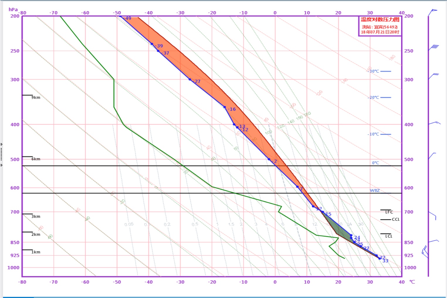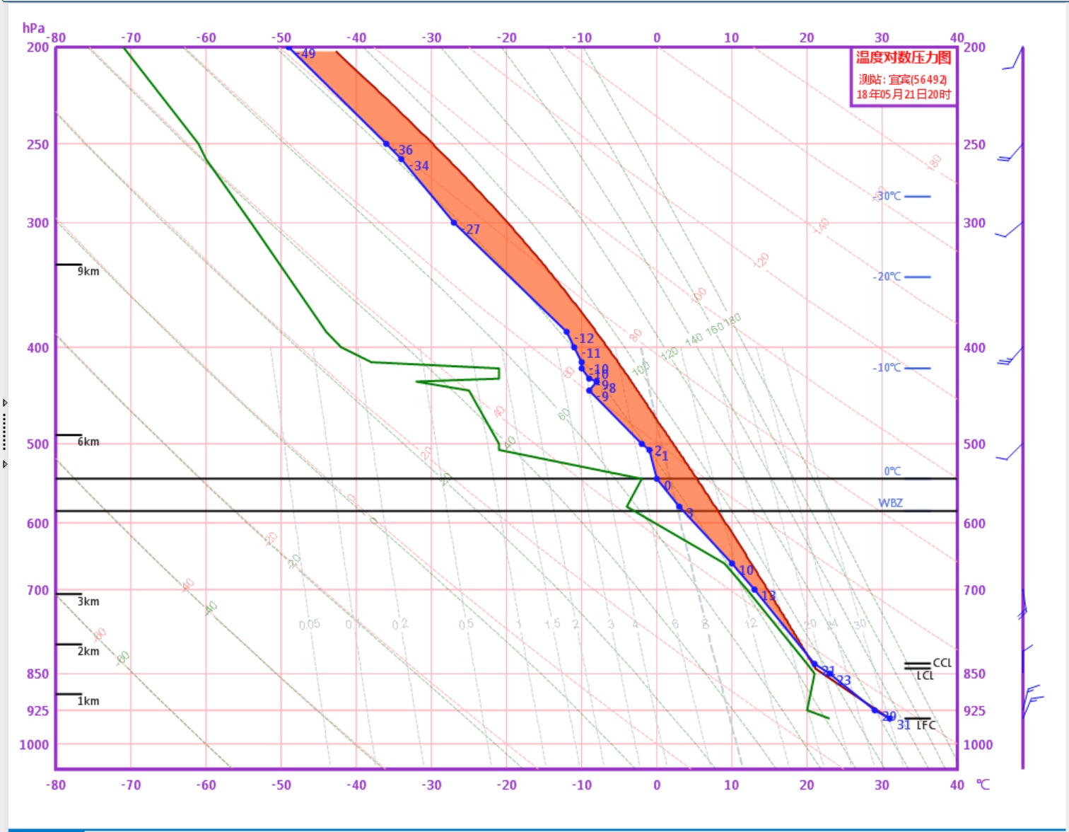 利用宜宾站T-logp图,从层结结构、对流不稳定、水汽、风切变等角度分析自贡对流性大风过程发生前的环境条件。