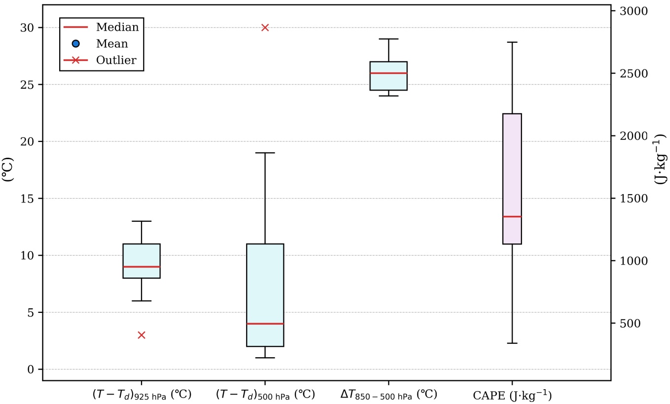 Figure 2. Typical T-logp diagrams of convective gale processes and boxplots of temperature-dew point depression and convective available potential energy in Zigong Area