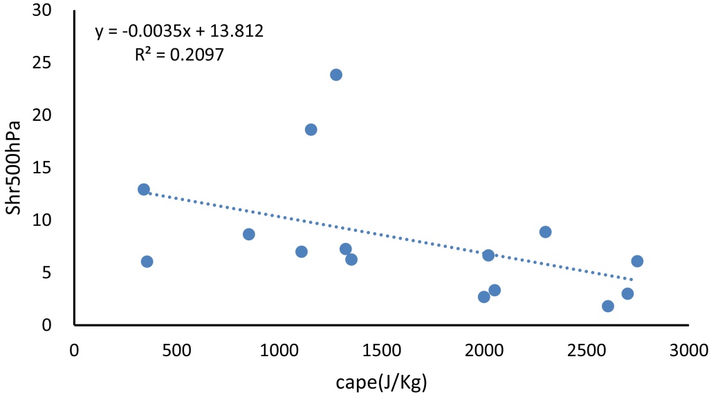 垂直风切变是产生极端大风的重要动力条件,有利于对流风暴组织化,从而导致下击暴流。文中对近地面到700 hPa、500 hPa及400 hPa的垂直风切变(分别以Shr700 hPa、Shr500 hPa、Shr400 hPa表示)进行了统计分析,结果显示(图3(a)) Shr700 hPa、Shr500 hPa、Shr400 hPa的平均值分别为11.1、9.4、10.5 m/s,25%到75%分位数值分别为6.9~14.9 m/s、4~15.4、8~14.9 m/s,Shr500 hPa波动相对较大,Shr700 hPa和Shr400 hPa数据分布相对更为集中,更适用于作为预报指标参考,以25%分位值作为指标阈值,则分别为6.9 m/s和8 m/s。同时,文中对大风发生前的CAPE与风切变进行相关性分析发现,CAPE与Shr500 hPa二者之间存在一定的相关性(图3(b)),Pearson相关系数为−0.46,表明CAPE和垂直风切变存在一定的互补作用,当垂直风切变比较大时,不需要很高的CAPE就能产生极端雷暴大风;当CAPE比较大时,产生极端雷暴大风的垂直风切变阈值就更小。