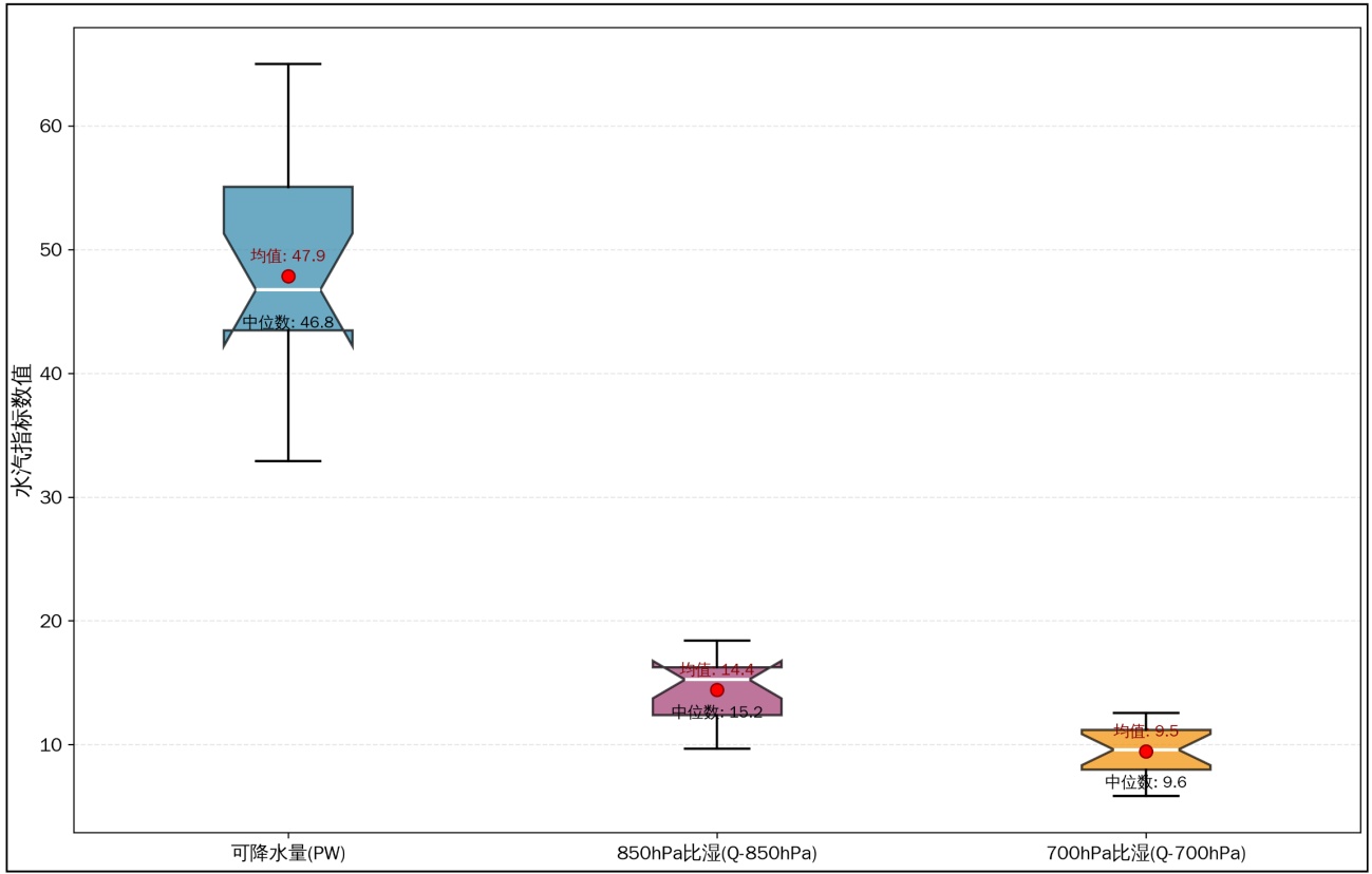 在对流性大风过程中,降水的拖曳作用是加强下沉气流速度的重要原因之一,文中对15次大风过程的大气可降水量(PW)、700 hPa和850 hPa比湿进行的统计分析,结果显示(图3(c)),自贡地区所发生的对流性极端大风过程中PW的波动较大,最小值仅有34 mm,而最大值可达65 mm,25%到75%分位值为42~55 mm,表明不同过程的大气总水气条件差异较大,850 hPa和700 hPa的比湿Q则表现相对稳定,其箱线图显示这两个不同高度层的25%~75%分位值分别为12~16 g/kg、7~10 g/kg,数据相对较为集中,可根据此范围作为对流性大风的预报指标。