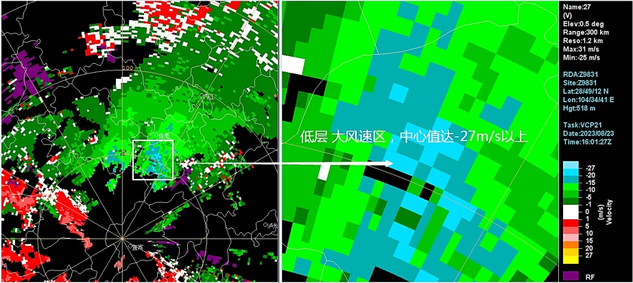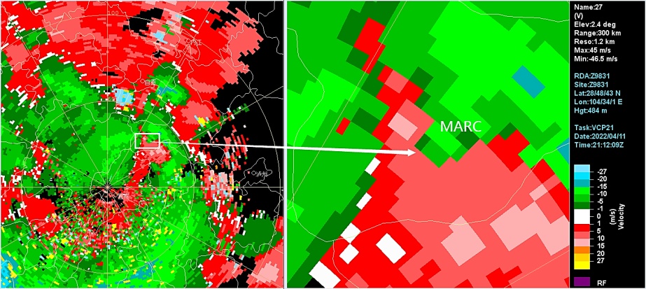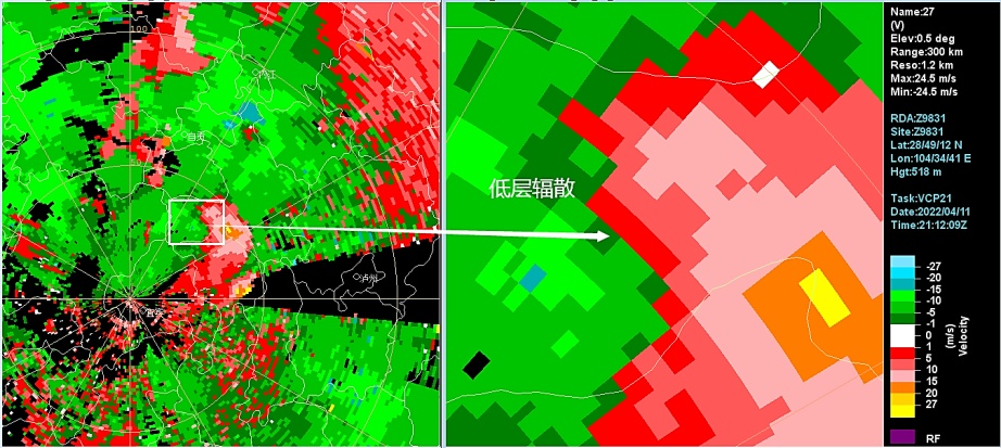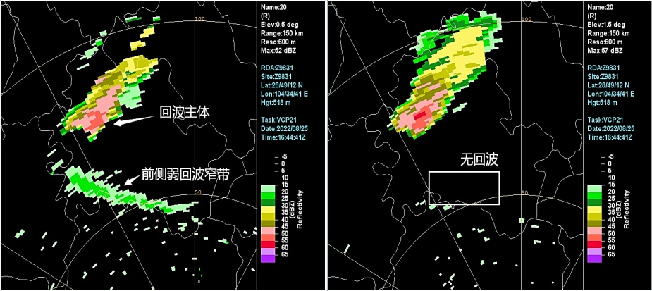 径向速度分析结果显示,中层径向辐合(MARC)、低层辐散以及低层显著大风速区是出现极端大风的主要特征,中层径向辐合(MARC)强度范围普遍在15~45 m/s,从监测到MARC到出现9级以上大风的时间提前量为11~60分钟,低层辐散(0.5˚仰角)从监测到出现大风的时间提前量为1~56分钟,低层大风速区监测到大风出现的时间提前量为10~60分钟,但这也与监测区域移动性回波与本地大风观测站点的距离有关;三类主要特征可单独出现,也可组合出现,当低空急流与MARC或低层辐散和MARC组合出现时对大风的预警效果更优。图5是对流性大风过程常见的雷达监测特征指标,如2022年4月11日晚上自贡的一次极端对流性大风过程,速度图(图5(a)、图5(b))显示,在2.4˚仰角有明显的MARC,且对应位置0.5˚仰角配合有明显的低层辐散,此次过程造成了该区域最大12级阵风(富顺李桥36.9 m/s);2023年8月23日下午,雷达速度(图5(c))显示低层0.5˚仰角有明显低空急流,中心速度值达−27 m/s,而对应实况出现了最大12级阵风(沿滩联络32.8 m/s);2022年8月25日晚上,0.5˚仰角雷达回波显示荣县西北侧有强回波,且回波前侧有一弱回波窄带,抬升仰角到1.5˚后回波窄带消失,表明此弱回波窄带为回波主体前侧近地面的阵风锋,此次过程造成了最大10级阵风(荣县新桥26.3 m/s)。