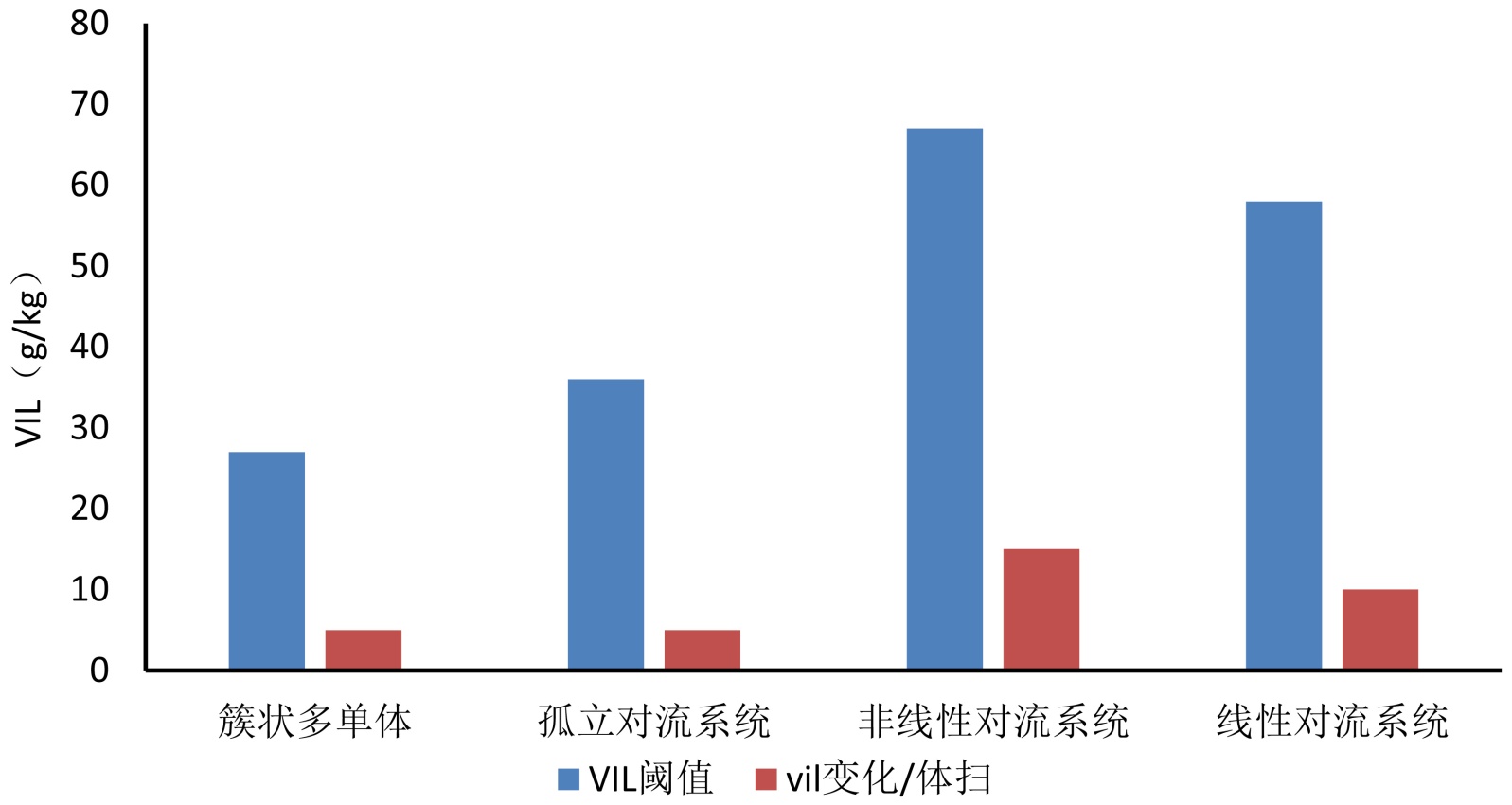 另外,通过对不同回波类型的VIL进行统计分析发现(图6(b)),孤立对流系统发生对流性大风的VIL阈值为27 kg·m−2,簇状多单体回波的VIL阈值为36 kg·m−2,非线性对流系统阈值为67 kg·m−2,线性对流系统为58 kg·m−2,且95%以上的个例伴有VIL的突然下降,据统计,以VIL快速下降作为出现大风的指标判定标准,需满足以下条件:当VIL强度低于40 kg·m−2时,在1个体扫时间内VIL下降值 ≥ 5 kg·m−2以上,当VIL大于40 kg·m−2时,1个体扫下降值 ≥ 10kg·m−2,当VIL大于60 kg·m−2时,下降值 ≥ 15 kg·m−2。