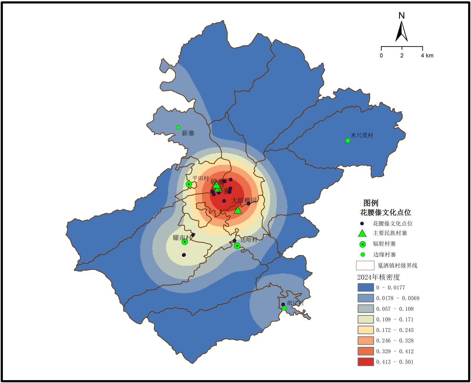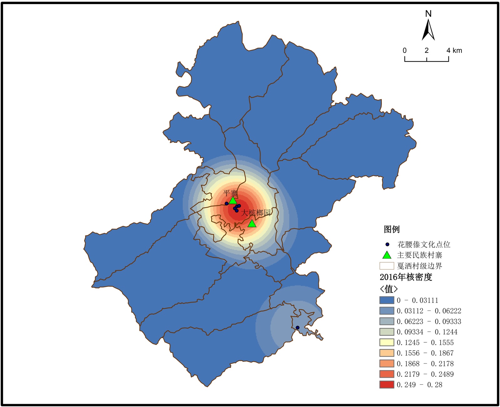 本研究采用核密度分析方法,依托ArcGIS平台,对2016年与2024年花腰傣文化载体点的空间分布密度进行测算与对比,其方法合理性已得到同类村落时空研究的验证[7]。