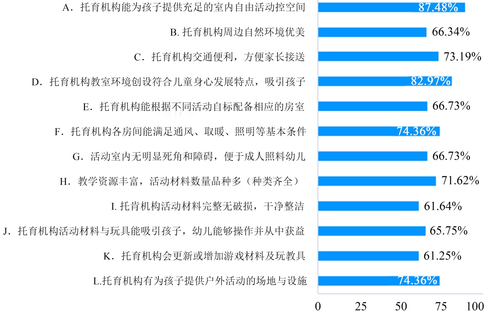 由图2可知,成渝地区家庭对托育机构环境的需求中,家长最在意的环境内容:充足的室内空间比例为87.48%、环境创设符合幼儿身心发展特点的需求比例为82.97%、充足的户外活动空间以及房间的通风、照明、取暖德国基本条件的需求占比均为74.36%,交通便利,方便接送的需求比例为73.19%。其余项目需求比例均在百分之60左右。由此可见,家长对托育机构环境的需求更多表现在空间是否充足以及环境与幼儿身心发展的契合度层面。