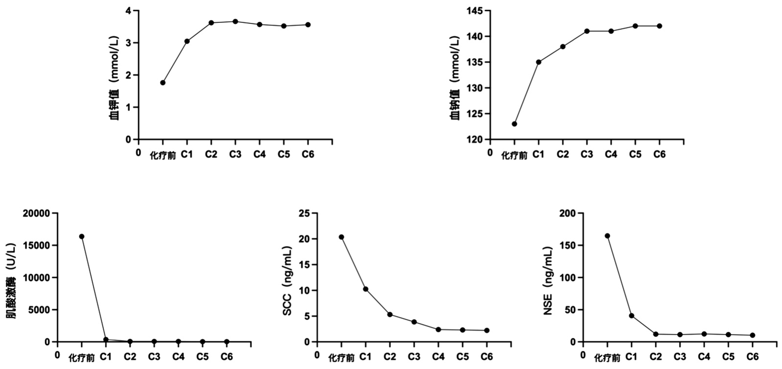 图4. 血钾、血钠、肌酸激酶、神经元特异性烯醇化酶(NSE)及鳞状细胞癌相关抗原测定(SCC)随化疗周期变化(注:C1为第1周期化疗后)