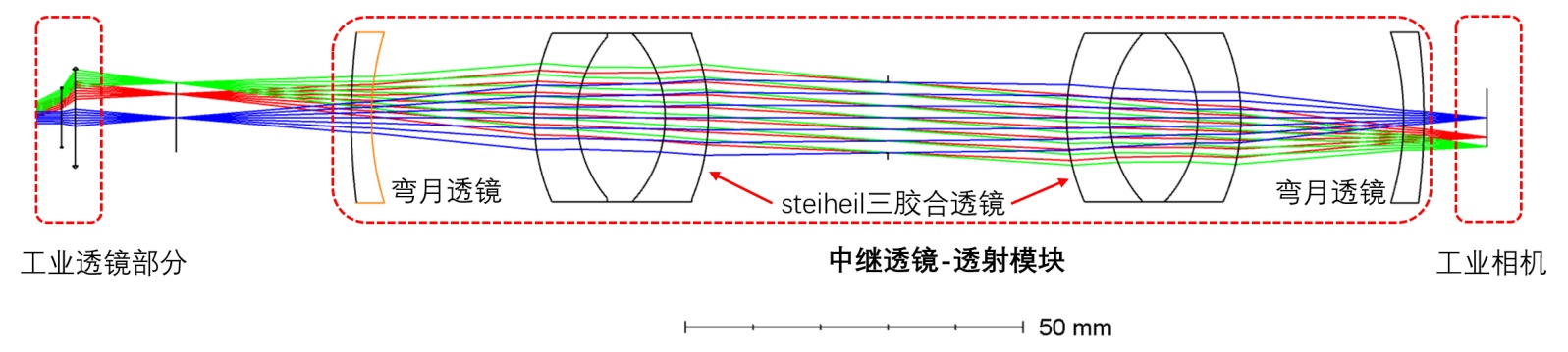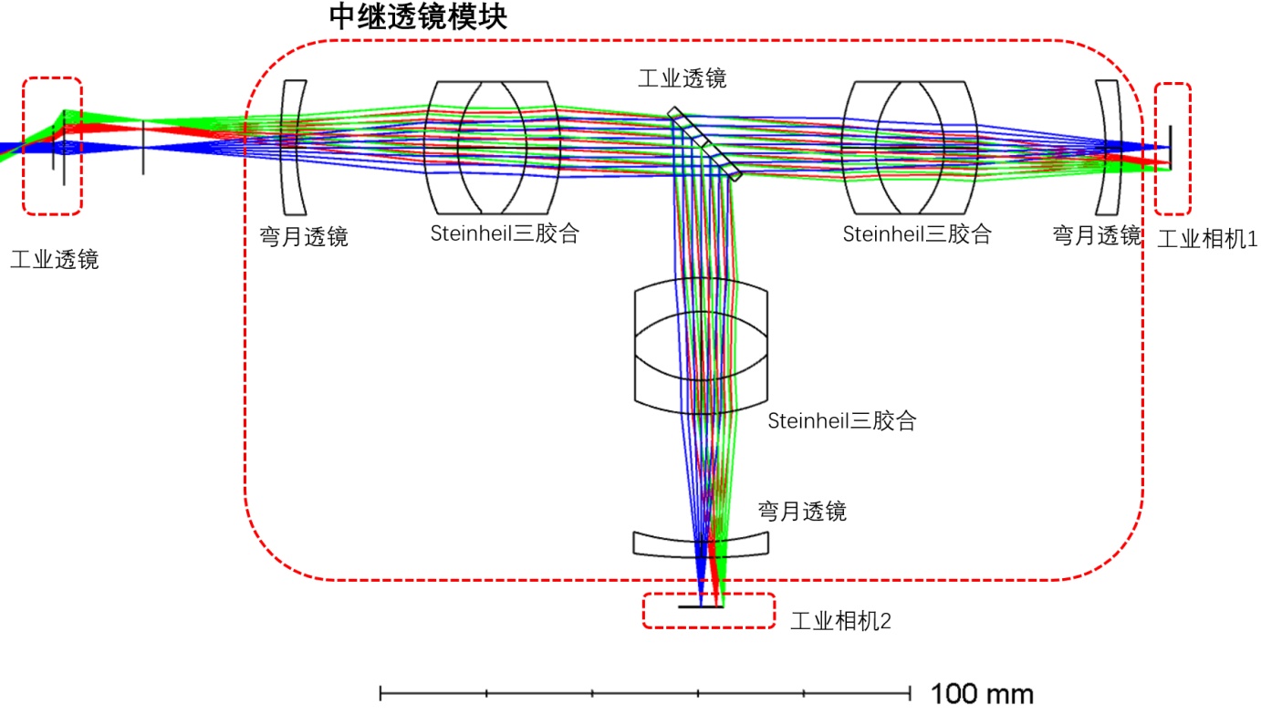 针对上述技术瓶颈,本文实现了一种基于有限共轭结构的血流/血氧双光路成像光学系统设计方案。该方案的核心创新点在于:通过定制化中继透镜组的光学设计,对标准C-Mount镜头的后焦距进行定向扩展,为分光元件、滤光模块的灵活集成提供充足的光学空间,保障血流/血氧同步成像的工程化实现;同时采用近对称化光学系统架构设计,通过光路参数优化实现中间光线的高准直度,有效降低光束孔径角对滤光特性的影响,保障血流/血氧双光路成像质量的一致性。